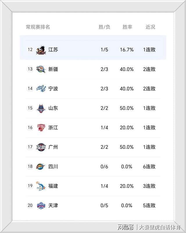 榜尾方面,5连败的天津男篮排在倒数第一,4负1胜的福建男篮和6连败的四川分列排在倒数二三位。