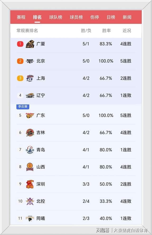 由于先赛一轮,卫冕冠军广厦队以5胜1负冲上榜首,北京男篮和广东男篮均5胜0负,但前者依旧高居排名第2,而后者则落后上海和辽宁,只能排在第5位。