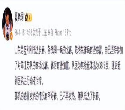 另一个感冒的则是郭凯,此前对阵江苏队,他都没有打。如今情况已经好转,随队来到了长春,大概率是要登场的。