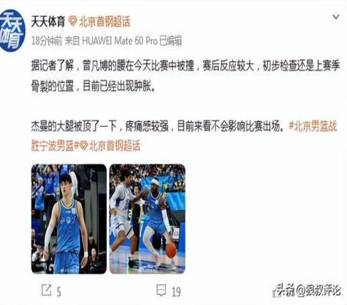 北京时间1月18日,CBA常规赛继续开打,北京男篮94-86击败宁波男篮,新赛季双杀对手。 但本场比赛的过程比较惨烈,曾凡博,杰曼均出现不同程度的伤病。 根据北京媒体《天天体育》的报道,曾凡博的腰在今天比赛中被撞,赛后反应较大,初步检查还是上赛季骨裂的位置,目前已经出现肿胀。 杰曼的大腿被顶了一下,疼痛感较强,目前来看不会影响比赛出场。 北京男篮目前遭到伤病困扰问题突出,除了曾凡博和杰曼本场比赛受伤外,国家队的核心后卫赵睿,以及内线周琦同样有伤在身。 根据北京主帅许利民此前采访透露,赵睿预计需要2月份才能复出,这就意味着接下来多场硬仗,北京男篮核心后卫赵睿仍处于伤停阶段。 周琦则是上一场对阵山西的比赛,眼睛被打了一下,同样旧伤复发,需要周一才有检查结果。 曾凡博的腰伤是上个赛季的季后赛对阵山西期间,与刘传兴对抗后重伤倒地,遭到赛季报销,几乎是休养了一个夏天,曾凡博才重新回归到比赛场上,但整体状态与去年的年初相比,差距明显。 杰曼下半场在无对抗的情况下,遭到伤病困扰,随后被换下场检查。 值得一提的是邱天本场比赛复出,但只打了几分钟,随后再也没有进入轮换阵容。 北京男篮接下来的赛程比较艰难,1月份的对手分别是上海,浙江,北控,山西,天津。 上海和山西都是季后赛区域的球队,浙江换帅之后战绩狂飙,同样不容小视,北控的同城德比大战,几乎是不需要动员的焦点对决。天津换帅后,取得一波3连胜。 |