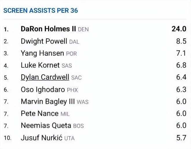 除此之外,根据NBA官方最新公布的数据,杨瀚森本赛季每36分钟掩护助攻7.1次,高居联盟第三。这个数据无疑是非常出色的,也代表着杨瀚森无球掩护的价值相当高。虽然这个数据并不会记录在数据栏上,但实际上他背后彰显的是这位球员的球商以及对球队的潜在贡献。