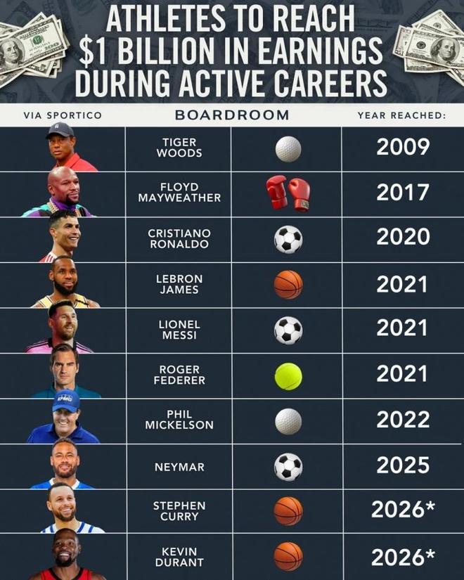 12月20日,据美国媒体Boardroom报道,2009年,老虎伍兹凭借联邦快递杯奖金,使职业生涯总收入突破10亿美元,成为历史上首位在职业生涯中仍在赛场上就达到十位数收入的运动员。 随后,勒布朗成为NBA首位现役亿万富翁,而库里和杜兰特基于他们的薪资、代言合同及商业投资,预计到本季结束时,他们的总收入将达到37亿美元。
