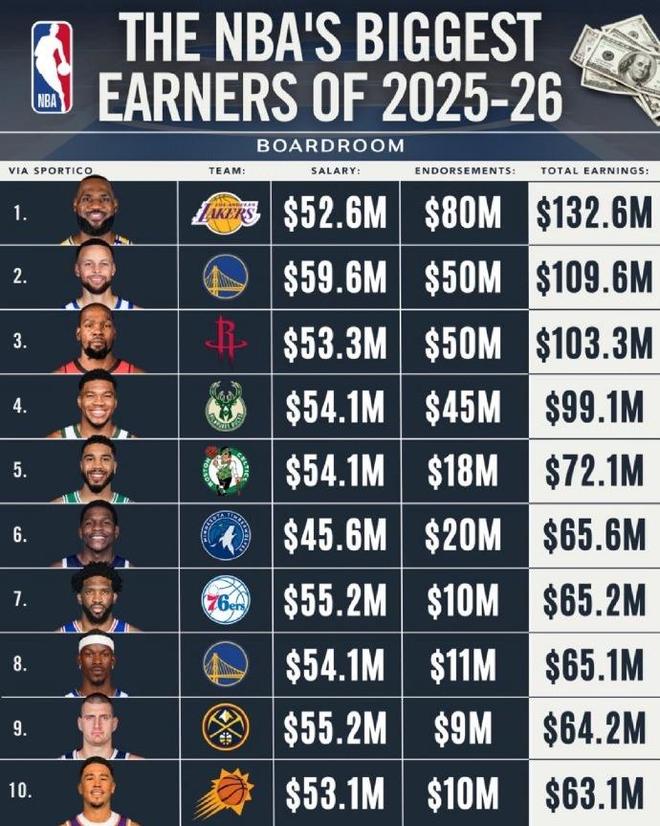 勒布朗·詹姆斯、斯蒂芬·库里和凯文·杜兰特在球场上建立了名人堂级别的职业生涯,在球场外也打造了庞大的商业帝国。 2025-26赛季,NBA收入最高的球员当中,詹姆斯的年薪高达5260万美元,商业收入8000万美元,总计1.326亿美元高居第一。库里年薪高达5960万美元,商业收入5000万美元,总计1.096亿美元,排名第二。杜兰特年薪高达5330万美元,商业收入5000万美元,总收入1.033亿美元,排名第三。 而字母哥9910万美元排在第4,塔图姆7210万美元排名第5,爱德华兹6560万美元排名第6,恩比德6520万美元排名第7,巴特勒6510万美元排名第8,约基奇6420万美元排名第9,德文-布克6310万美元排名第10。