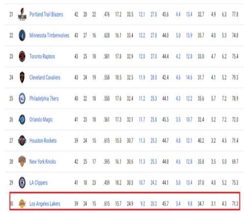 但是,本赛季湖人的防守成为了大漏洞。湖人防守糟糕的问题已经存在不止一个赛季了,球队不仅没有引进足够好的防守悍将,反而导致球队的防守越来越差。湖人本赛季限制对手投篮命中率48.9%,排名联盟倒数第三差,同时是湖人队史近40年最差的表现。 湖人目前的阵容配置决定了他们无法成为防守强队。中锋位置上,艾顿从来不是优秀防守者。海斯只能算是中规中矩的替补。前锋位置上,湖人只有范德比尔特一位防守好手。后卫线上,湖人原本指望斯马特提升防守能力。但是斯马特已经过了巅峰期,撑不起湖人的防线。 湖人球星东契奇和里夫斯都属于攻强守弱,41岁的詹姆斯在防守端也远不如从前,无法在防守端总是保持专注。 这场对阵开拓者的比赛,湖人总是被对手轻易地突破防线,而且在艾顿和海斯都缺阵的情况下,内线基本上没有任何保障。这一战开拓者投篮命中率52%,三分命中率38%。开拓者第一节轰下40分,第二节轰下31分,第三节得到36分。到了末节,球队大比分领先,进攻有所收敛,仍然得到25分。 湖人暴露的第二个漏洞是篮板球糟糕。这一战,湖人篮板球27比42处于绝对劣势。过去几年,湖人内线好歹有浓眉哥这位篮板球高手撑场面。本赛季,湖人无人场均篮板球上双。艾顿场均抢到8.7个篮板排名全队第一。