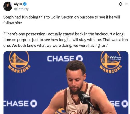 黄蜂队这样的防守也让比赛中上演有趣的一幕,第二节库里一直走到球员通道,防守他的塞克斯顿都一路尾随寸步不让。 赛后库里谈及这一幕时表示:“那个回合我是故意在后场待了好久,就是想试试他能跟我多久,我俩都心知肚明在干嘛,玩得挺开心。”