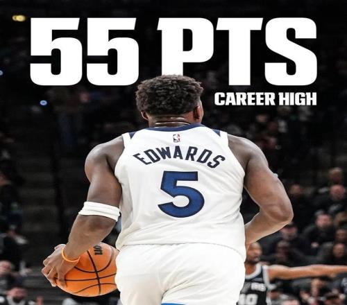 大概是什么概念呢? ——55分是爱德华兹生涯的最高分,此前最高是53分 ——生涯第3次单场50+,第26次40+ ——55分追平了本赛季所有球员的第二高分 ——森林狼队史单场第四高分(前三全是唐斯) ——单场9记三分,生涯第二高