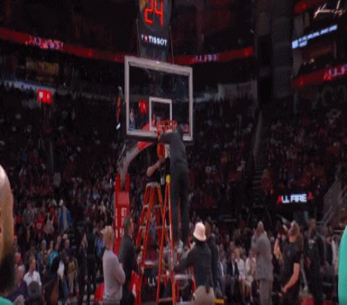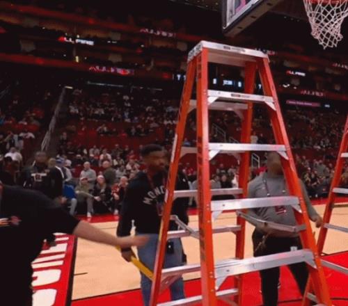 少林功夫好耶 现场工作人员立马紧急出来维修 傻嗨,不,是索汉还想爬梯子云修筐,结果被比永博大手一把给拽回来了 为了不影响现场维修,马刺球员也无法再热身,他们只好被迫比赛还没开始就全体返回更衣室”面壁思过“去了
