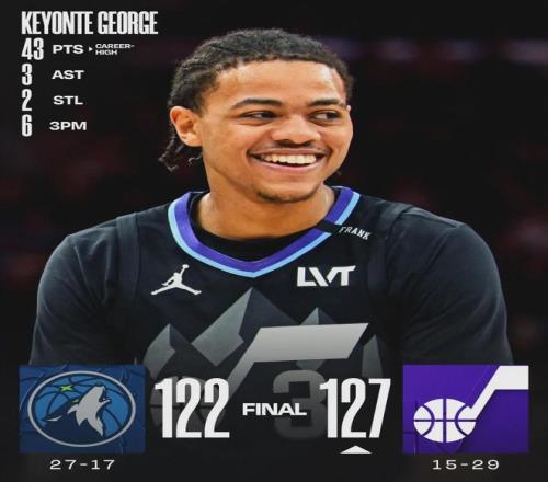 北京时间1月21日,NBA常规赛:爵士主场127-122逆转森林狼。第四节爵士轰下43分,森林狼仅得26分,森林狼遭遇3连败。今天湖人、火箭和太阳全赢球了,森林狼27胜17负跌至西部第7,爵士15胜29负继续排名西部第13。