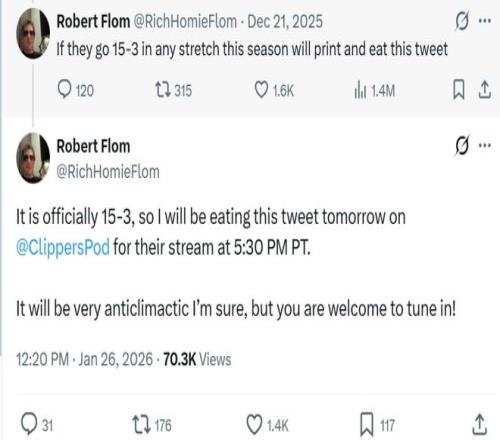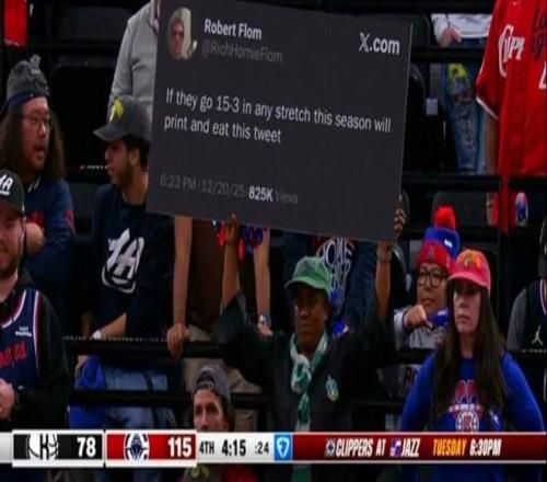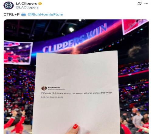 也正是在小卡的带领下,快船队才在过去18场比赛拿下15胜3负表现,也让一名此前口嗨的球迷沦为笑柄。 开局快船陷入困境时,一名网友曾公开表示如果本赛季快船任何阶段打出15胜3负表现,自己将打印这条推文并吃掉。 结果快船队如今做到这一壮举,快船主场球迷也将这一推文打印后直接晒照点名键盘侠。