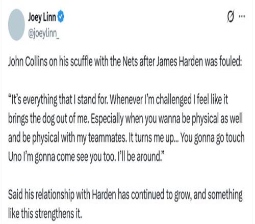 这让哈登获得一众快船球员的尊重,也在比赛中因乌龙一幕险些发生冲突。 起因是第三节还剩10分钟时,哈登试图反击上篮,篮网杰明选择战术犯规的同时,有一个保护动作试图保护倒地的哈登,结果引起科林斯误会,后者上前一把推飞了杰明,曼恩回推科林斯,双方险些发生冲突。 赛后科林斯直言:“这就是我的行事风格,如果有人想碰哈登,那我一定会揍他(You gonna go touch Uno I’m gonna come see you too),我随时都在。”