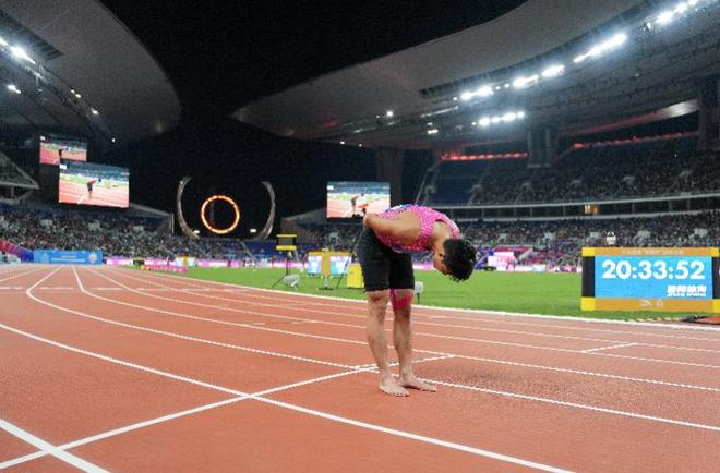 苏炳添在比赛后向观众致意。新华社发 赛后,现场响起经典粤语歌《讲不出再见》,数万名观众用持久而热烈的掌声,向这位创造了黄种人短跑奇迹的“亚洲飞人”致敬。而苏炳添则绕场谢幕向观众告别,他说:“能够坚持到今天,在我的家乡跟大家说一句再见,我感到非常荣幸。今天看整个体育场都是高朋满座的,谢谢你们的到来!”