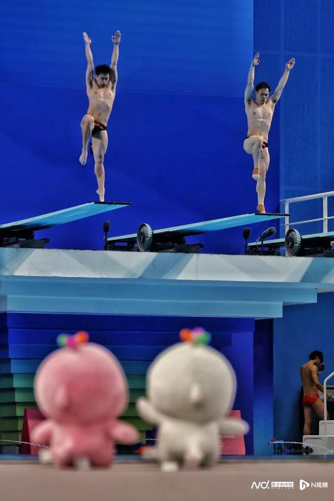谢思埸/黄博文在比赛中。 在率先进行的双人3米板项目中,广东两对组合谢思埸/黄博文、郭昊宇/胡宇康分别以258.48分和257.46分位列第二和第三,奥运冠军王宗源搭档世界冠军郑九源以266.88分拿下这个小项的头名。第一项过后,广东队以36.96分的优势领跑。