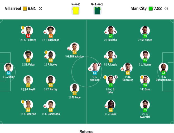 比利亚雷亚尔首发:1-路易斯·儒尼奥尔、15-穆里尼奥、8-福伊特、12-维加、24-佩德拉萨(46’23-卡尔多纳)、17-布坎南(66’20-莫莱罗)、14-康萨尼亚(72’22-阿约泽·佩雷斯)、16-托马斯、18-帕佩·盖耶(81’10-帕雷霍)、19-佩佩、9-米卡乌塔泽(66’21-奥卢瓦塞伊)。