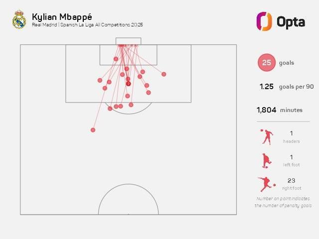 西甲第19轮,皇家马德里客场对阵毕尔巴鄂竞技,上半场姆巴佩远射破门,至此,姆巴佩本赛季俱乐部赛事已打入5粒禁区外进球,为五大联赛球员最多。