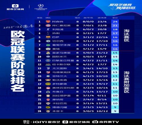 欧冠联赛阶段对阵全部结束,直通球队和附加赛球队均已出炉。前八的队伍中,英超占据5席,意甲法甲0席,卫冕冠军巴黎圣日耳曼连续第二年踢附加赛。 前8的联赛分布如下: 英超:阿森纳、利物浦、热刺、切尔西、曼城 德甲:拜仁 西甲:巴萨 葡超:葡体 附加赛区: 种子队: 皇马、国米、巴黎、纽卡、尤文、马竞、亚特兰大、勒沃库森 非种子队: 多特、奥林匹亚科斯、布鲁日、加拉塔萨雷、摩纳哥、卡拉巴赫、博德闪耀、本菲卡 阿森纳8战全胜以联赛阶段第一晋级16强,利物浦、热刺、切尔西、曼城均进入前八,纽卡第12名将参加淘汰赛附加赛。 皇马2-4不敌本菲卡,最后一轮掉出前8,而本菲卡也是凭借门将特鲁宾98分钟的头槌绝杀压哨晋级附加赛。 |