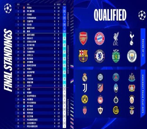此役过后,本赛季欧冠出线格局正式明朗,16强席位确定8队:阿森纳、拜仁慕尼黑、利物浦、托特纳姆热刺、巴塞罗那、切尔西、葡萄牙体育、曼城。 皇马意外以第9名进入附加赛,本菲卡则以第24名拿到附加赛门票,两队或许还有可能在附加赛再次碰面!