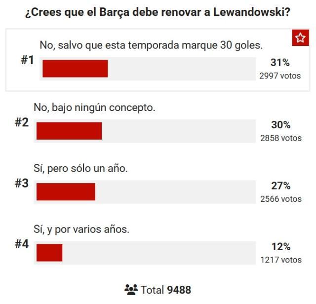 巴萨应否续约莱万?你怎么看 西甲 10-17 11:13 莱万与巴萨合同明夏到期,《马卡》报就巴萨是否应该与之续约发起网络调查,共9488名球迷参与投票,有30%认为无论如何都不续约—— ①不,除非他本赛季打进30球 31% ②不,任何情况下都不 30% ③是,但只续一年 27% ④是,续约好几年 12% 本季迄今,莱万为巴萨出场9次打入4球,其中4次首发,共出场431分钟。据西媒报道,莱万首选留在巴萨,至少留在欧洲,暂不考虑前往沙特、美国。而如果莱万离队,巴萨希望免签弗拉霍维奇,而马竞、米兰、尤文有意免签莱万。 |