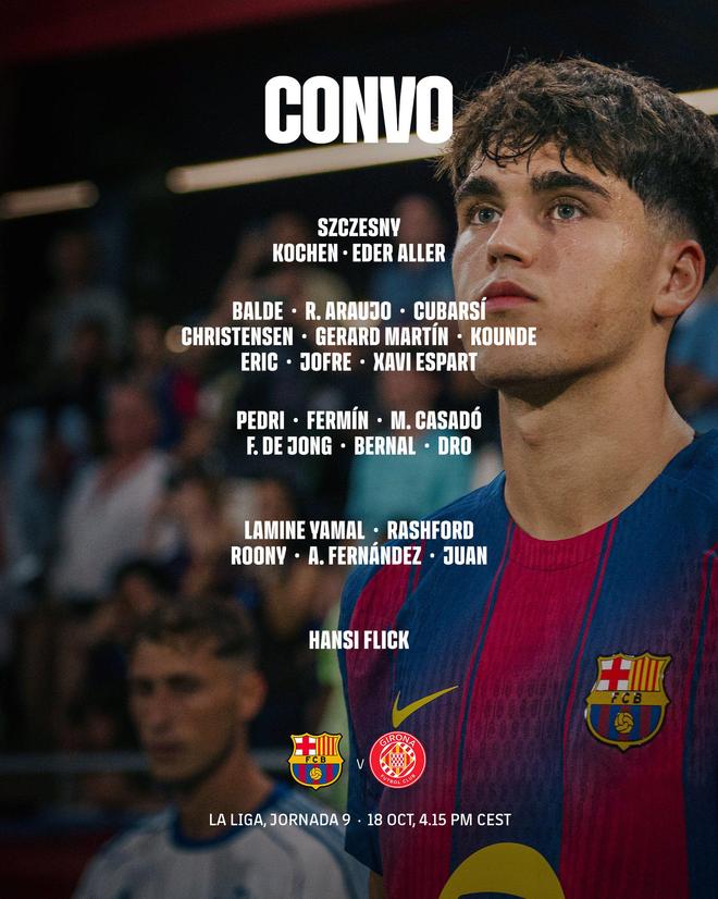 雷速体育10月18日讯 巴塞罗那俱乐部官方公布了本轮西甲主场对阵赫罗纳的球员名单,亚马尔和费尔明榜上有名、复出在即。 巴萨本轮球员名单 门将:什琴斯尼、科亨、埃德尔·阿勒 后卫:巴尔德、罗纳德·阿劳霍、库巴西、克里斯滕森、杰拉德·马丁、孔德、埃里克、霍弗雷、哈维·埃斯帕特 中场:佩德里、费尔明、卡萨多、德容、伯纳尔、德罗·费尔南德斯 前锋:亚马尔、拉什福德、巴尔德吉、A·费尔南德斯、胡安·埃尔南德斯 |
