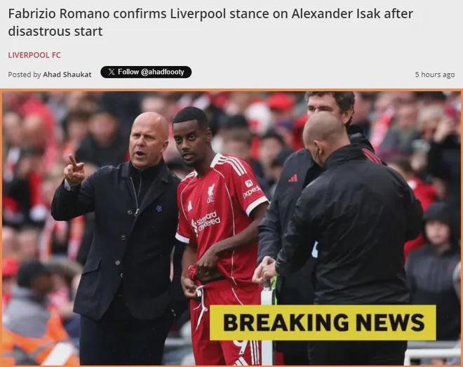 罗马诺在Here We Go podcast上谈到了伊萨克目前在利物浦的情况,他表示红军对这名前锋依然很有信心。 罗马诺说:“伊萨克基本上就没有参加季前赛,他确实曾和私人教练进行单独训练,但这和从7月份开始就完整的参加季前备战是两个概念,所以这是完全不同的。 而且从精神层面上说,伊萨克夏天为了加盟利物浦和纽卡斯尔开战,这是个复杂的夏天,身心都是。利物浦确信,只要伊萨克找回身体状态,他就会闪耀、会进球的。 所以利物浦并不担心伊萨克的情况。”