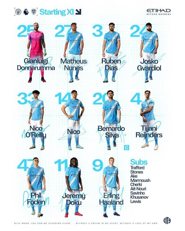 曼城首发:25-多纳鲁马、27-马特乌斯-努内斯、3-鲁本-迪亚斯、24-格瓦迪奥尔、33-尼科-奥赖利、14-尼科-冈萨雷斯、20-伯纳多-席尔瓦、4-赖因德斯、47-福登、11-多库、9-哈兰德 替补:1-特拉福德、5-斯通斯、6-阿克、7-马尔穆什、10-谢尔基、21-艾特-努里、26-萨维尼奥、45-胡桑诺夫、82-里科-刘易斯 利兹联首发:1-卢卡斯-佩里、2-博格尔、24-詹姆斯-贾斯廷、6-乔-罗顿、5-斯特鲁伊克、4-阿姆帕杜、22-田中碧、44-伊利亚-格鲁耶夫、7-丹尼尔-詹姆斯、29-尼奥托、14-卢卡斯-恩梅加 替补:16-梅利耶、25-拜拉姆、3-古德蒙松、15-比约尔、20-杰克-哈里森、11-阿伦森、19-奥卡福尔、10-皮罗埃、9-卡尔弗特-勒温