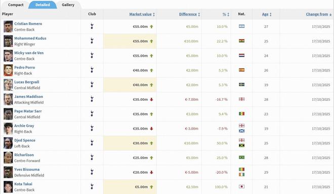热刺球员身价变更:库杜斯上涨1000万欧,麦迪逊下跌700万欧