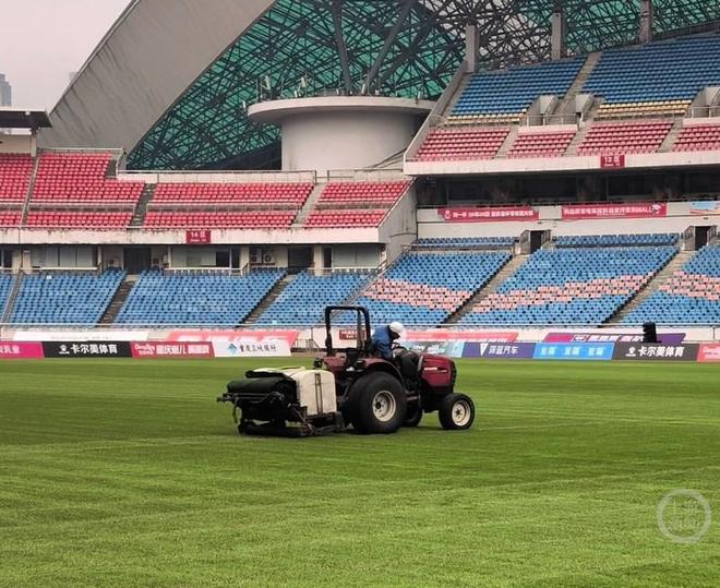 重庆奥体中心高级工程师梅修竹介绍准备情况。 作为曾经举办过中超联赛的球场,重庆奥体中心也对比赛区域进行了恢复和升级。记者在现场看到有工作人员驾驶着割草机,对草坪进行最后的维护,还有工作人员在安装球门后方的球网,对更衣室再次进行清洁,并布置场边的替补席。 据梅修竹透露:“我们在接到比赛任务之后,在11月中旬购买了冬季草草籽,对草坪进行了重新播种。为了能够赶上比赛,我们还进行了覆膜保温的处理,目前经过一个多月的精心养护,球场的天然草已经达到了比赛标准。同时我们还对功能用房,运动员、裁判员使用的房间都进行了重新装修,对灯光、音响、显示屏等设备进行了重新检修和调试,目前相关筹备工作已经顺利完成。”